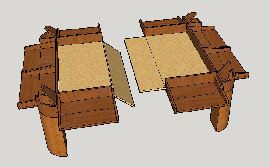 How to collapse it? Figured a 1’x4’ leaf hinged to each half of the table could fold under when collapsed, with the inner leaves either held to the underside by strong magnets or latches. Throw on the flip draws and we have this.